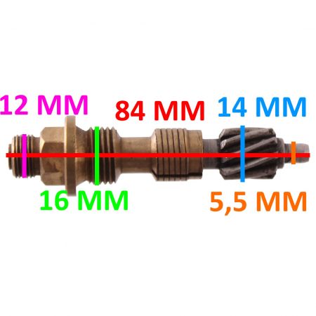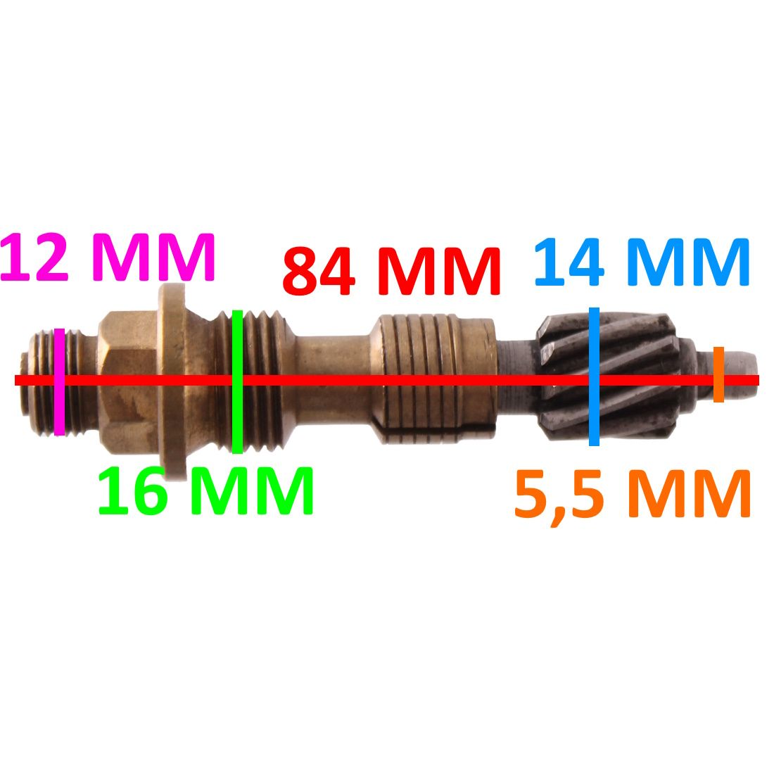 (R.11323) Vendo rinvio contakilometri con pignone da 9 denti usato pari al nuovo per moto Cagiva epoca probabilmente Freccia 125 cc con lunghezza totale 82 mm , diametro perno 5,5 mm , diametro pignone 14 mm e diametro filetti 12 mm e 16 mm , per misure vedere foto , controllare compatibilità prima dell'acquisto