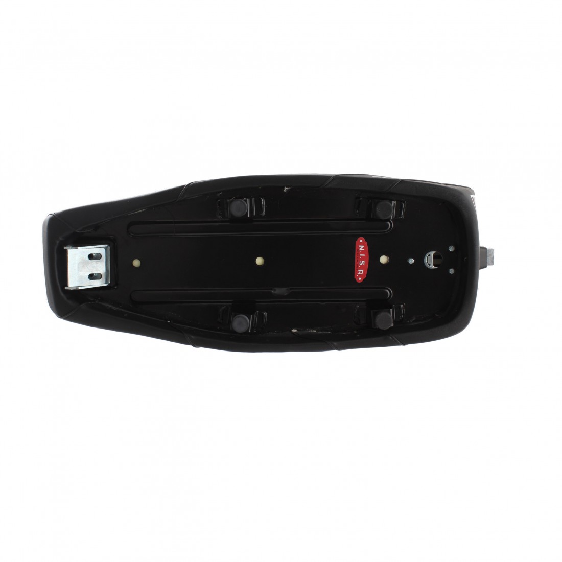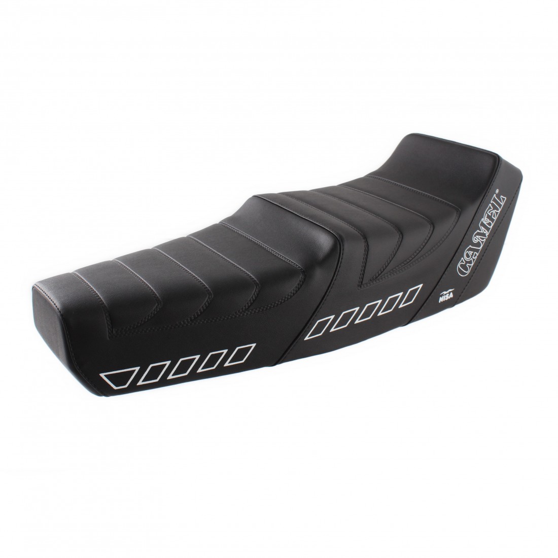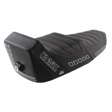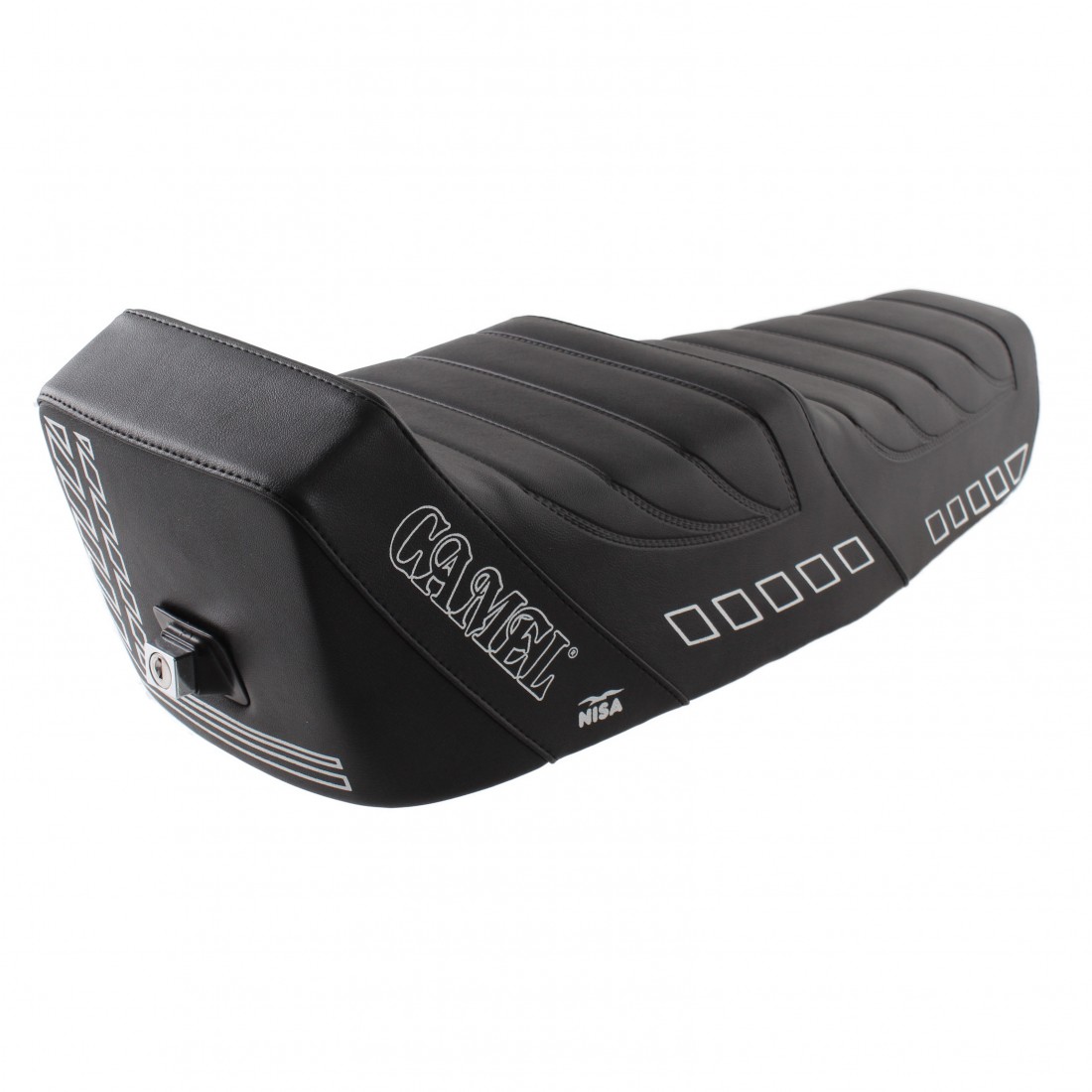 (R.15556) Vendo sedile lungo a due posti Nisa modello Camel nuovo per Piaggio Vespa 50 - Primavera - ET3 colore nero con decorazioni e scritte Camel e NISA bianche completo di serratura con due chiavi
