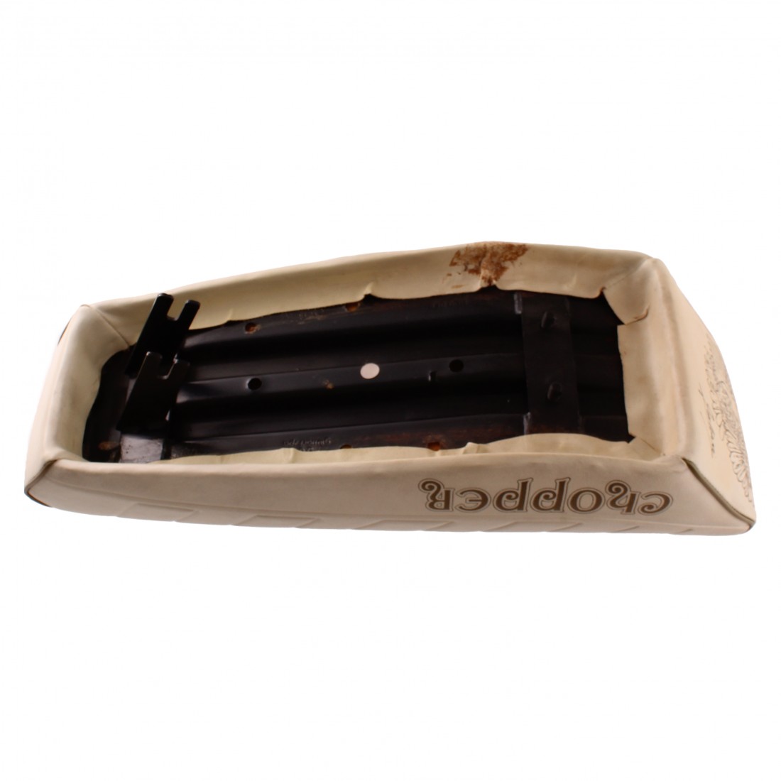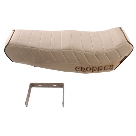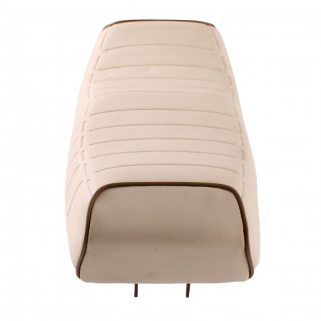 (R.21389) Vendo sedile lungo biposto nuovo con canotto tipo rettangolare per Piaggio Ciao R marca Giuliari modello Chopper di colore bianco con scritte e bordi marroni