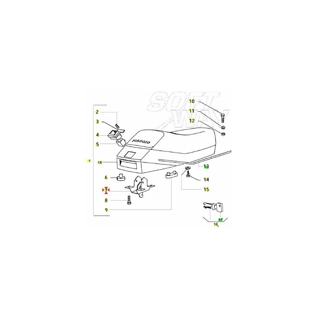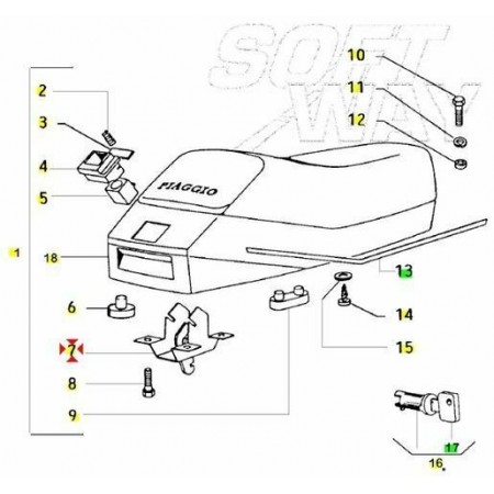 (R.3627) Vendo levetta per apertura sella nuova per Piaggio Vespa 50 N con telai V5X5T dal 1989 con codice Piaggio 265731, per applicazioni ed esploso vedere foto