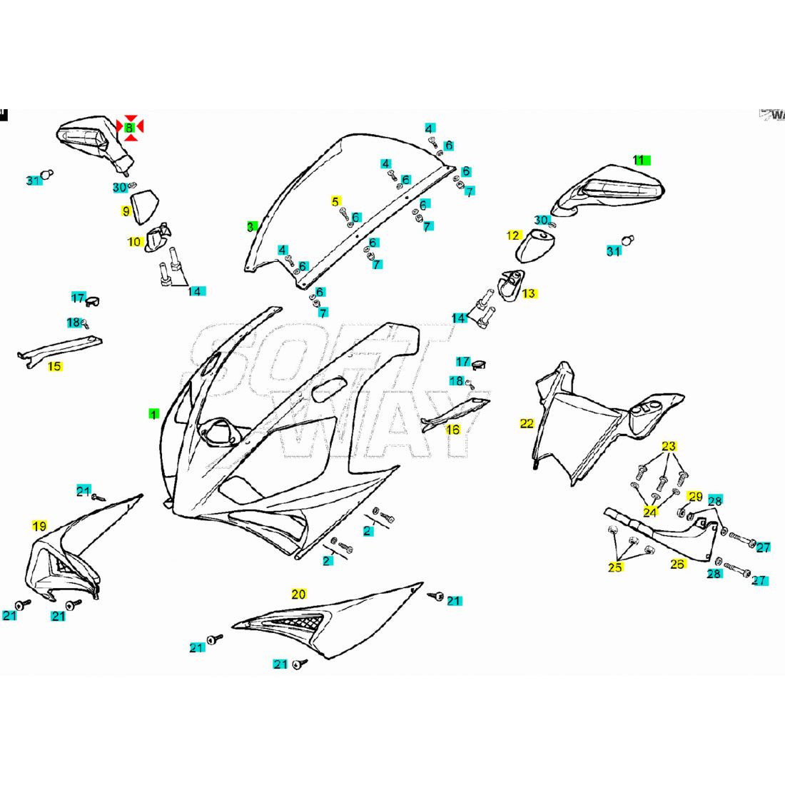 (R.23195) Vendo specchietto retrovisore destro usato con ganci del vetro portalampada rotti , originale Derbi con codice 00H02209671B per Derbi GPR R 50 dal 2008 - GPR Racing 50 e 125 dal 2004 - GPR Replica 50 dal 2005 , per applicazioni e spaccato vedere foto