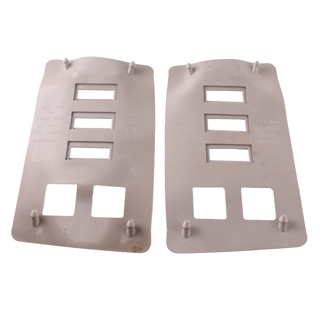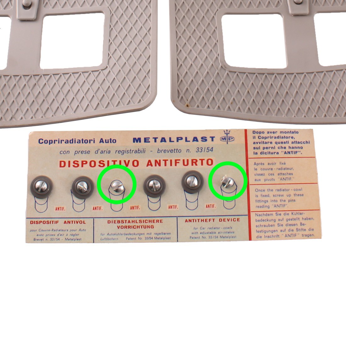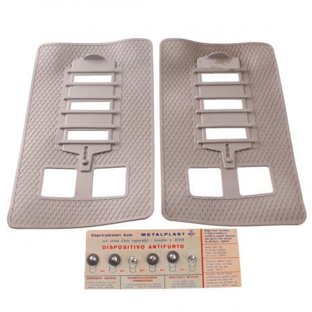(R.20156) Vendo copri radiatore con prese d'aria registrabili nuovo per Simca 1000 cc marca Metalplast con codice 752 di colore grigio con leggeri segni di magazzinaggio e mancante di 2 dispositivi antifurto come da foto , il prezzo si intende per l'intero kit