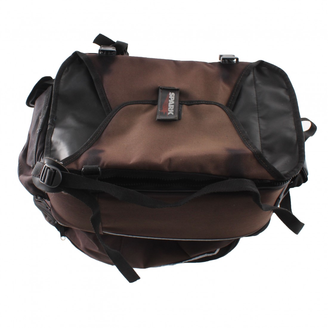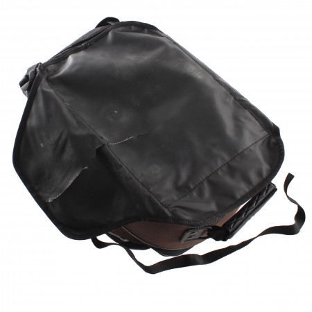 (R.13819) Vendo zaino borsa con attacco al serbatoio usato per moto varie sdoppiabile in uno zaino con spallacci e una borsa con maniglia di colore marrone completo di cuffia impermeabile in plastica di colore arancione con misure approssimative a capienza piena 260 x 370 x 300 mm , danneggiato come da foto , per misure vedere foto