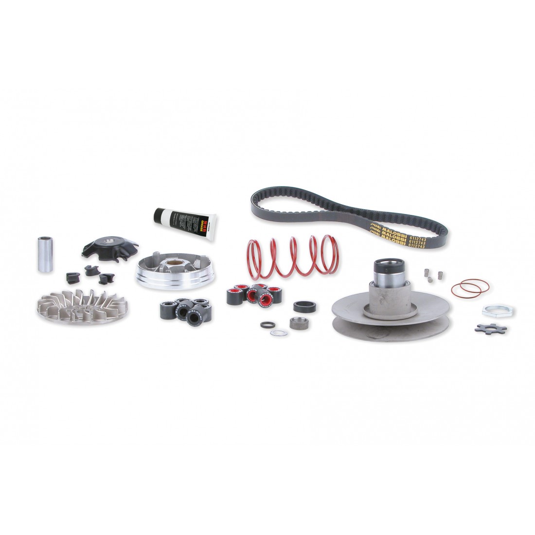 (R.19663) Vendo gruppo trasmissione con variatore e cinghia nuovo Malossi Over Range con codice 6112811 per scooter vari con motore Minarelli Yamaha 50 a due tempi tipo Aprilia SR - Amico - Area 51 - Gulliver - Rally - Scarabeo - Benelli 491 - K2 - Naked - Beta Ark - Eikon - Quadra - Italjet Dragster - Malaguti F12 Phantom - F15 Fire Fox - MBK Booster - Flipper - Mac - Nitro - Ovetto - Stunt - Yamaha Aerox - BW's - Jog - neo's - Slider - Spy - Why - Zuma , per applicazioni vedere foto