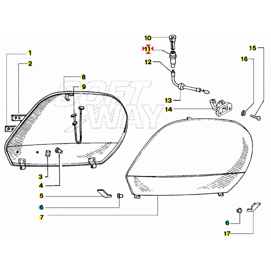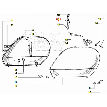 (R.14328) Vendo pomello del cavo comando apertura sportelli laterali nuovo per Piaggio Vespa PK XL 50 e 125 cc dal 1985 - PK XL Plurimatic cc dal 1985 - PK XL Rush cc dal 1988 - Vespa N dal 1989 - Vespa FL 50 e 125 cc dal 1989 - FL2 Automatica e HP dal 1990 con codice Piaggio pomello 234422 e supporto 234421 , il prezzo si intende per singolo pezzo , per applicazioni ed esploso vedere foto