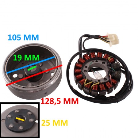 (R.19910) Vendo volano con statore nuovo per moto epoca di cui non conosciamo il modello marchiato Denso 032000-5750 con diametro interno 105 mm ed esterno 128,5 mm con conicità da 19 a 25 mm , il prezzo si intende per entrambi i pezzi , per misure vedere foto