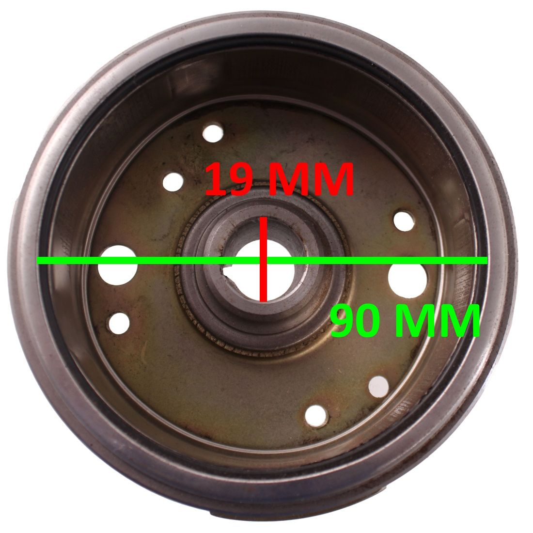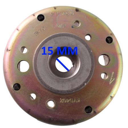 (R.23581) Vendo volano usato per scooter Kymco con rotazione destra marchiato KYD402 LAD9 8K10 con conicità da 15 mm a 19 mm e diametro interno volano da 90 mm , per misure vedere foto