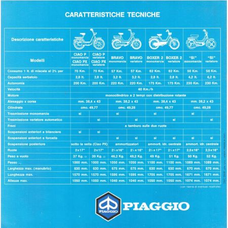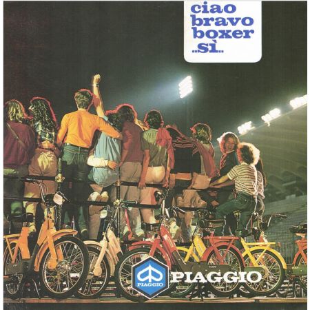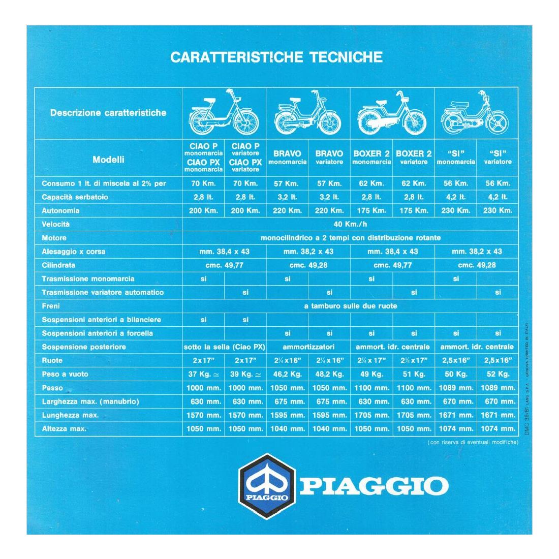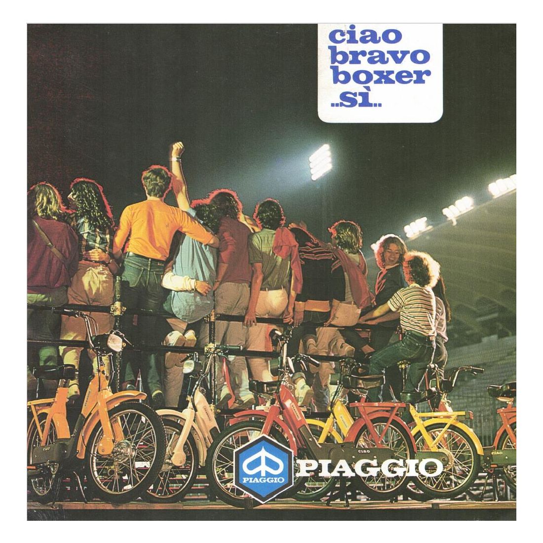 (R.24331) Vendo volantino nuovo con leggeri segni di magazzinaggio marca Piaggio che presenta i vari ciclomotori quali Ciao - Bravo - Boxer - Si